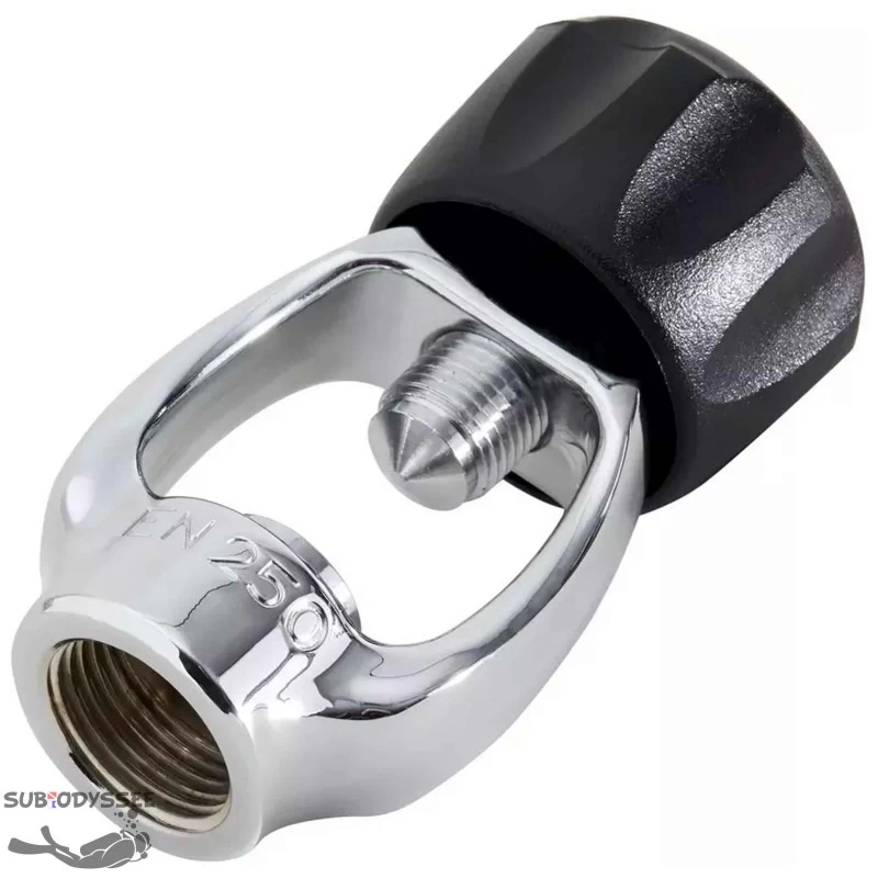 Adaptateur étrier permettant de passer d’un détendeur DIN à un détendeur international (INT) sans démontage.