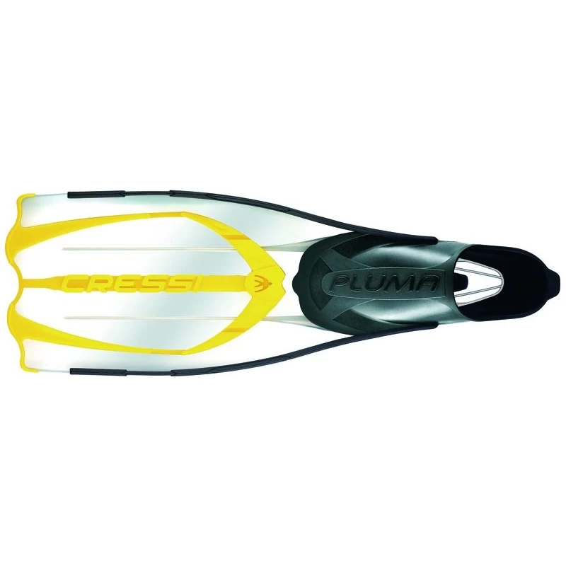 – Palmes modèle PLUMA chaussante caractĂ©risĂ©e par une voilure en matière flexible & souple qui fournit un palmage fluide & peu fatigant.